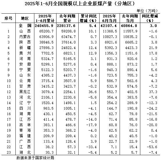 2025年1-6月份全國規(guī)模以上分省區(qū)原煤產量數據發(fā)布