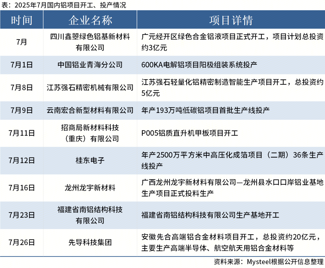 據(jù)不完全整理,2025年7月國內(nèi)共9個鋁項目開工、投產(chǎn)。