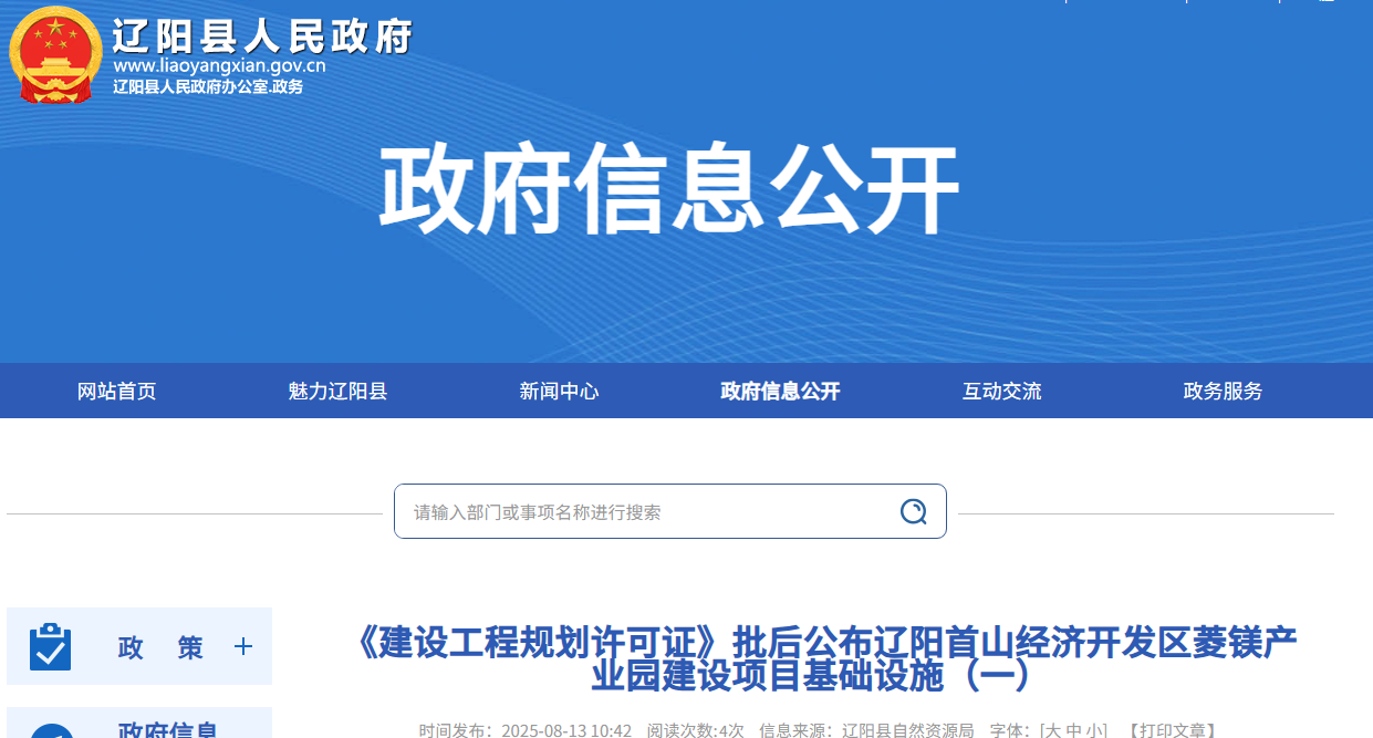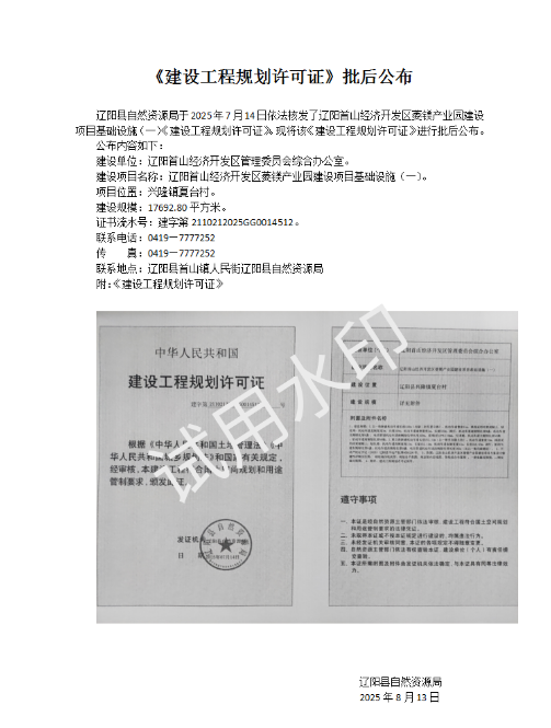 《建設(shè)工程規(guī)劃許可證》批后公布遼陽首山經(jīng)濟開發(fā)區(qū)菱鎂產(chǎn)業(yè)園建設(shè)項目基礎(chǔ)設(shè)施(一)